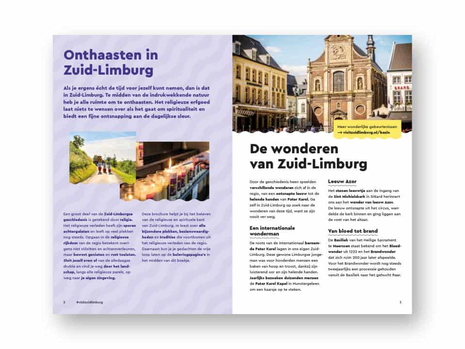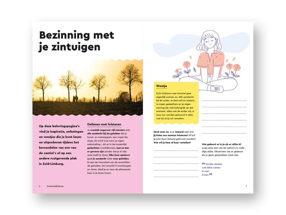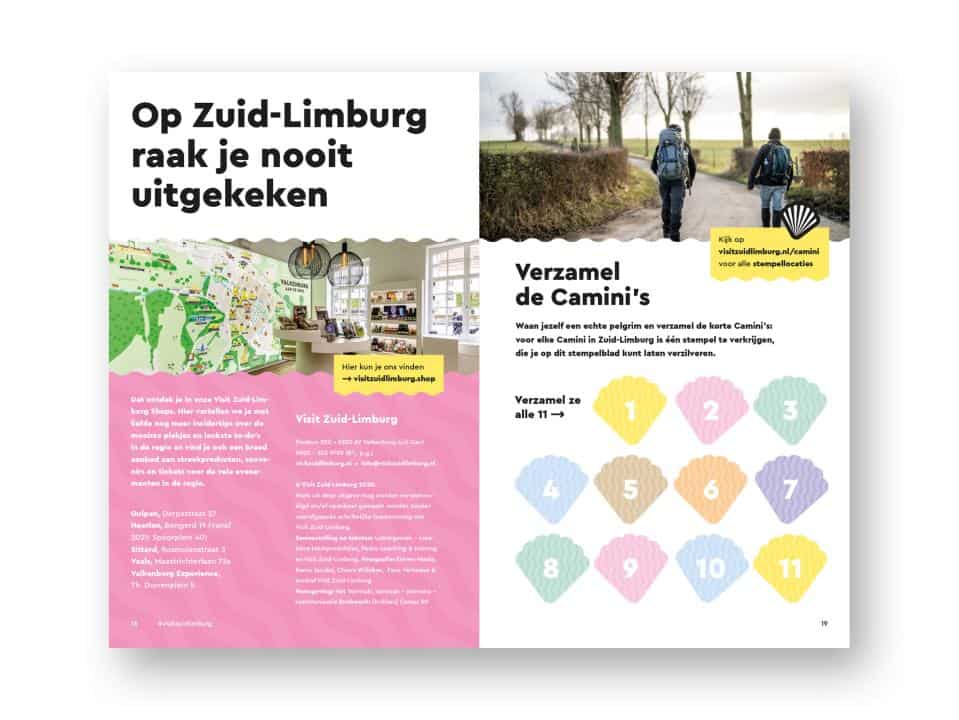 Brochure Bezin in Zuid-Limburg Ben je ook klaar met altijd ‘aan’ moeten staan? Heb je behoefte aan even helemaal niets en je eigen batterij opladen? Deze brochure helpt je bij het beleven van de religieuze en spirituele kant van Zuid-Limburg. Je leest over bijzondere plekken, wonderlijke gebeurtenissen en typisch Zuid-Limburgse tradities die voorkomen uit het religieuze verleden van de regio. Ontdek de camini’s, korte pelgrimservaringen van één dag speciaal ingericht op bezinning en bewustwording. Laat je gedachten de vrije loop gaan op de belevingspagina’s in het boekje en verzamel de 11 stempels. Met elke stempel die je verzamelt, leer je een levensles en kom je een stukje dichter bij jezelf.
