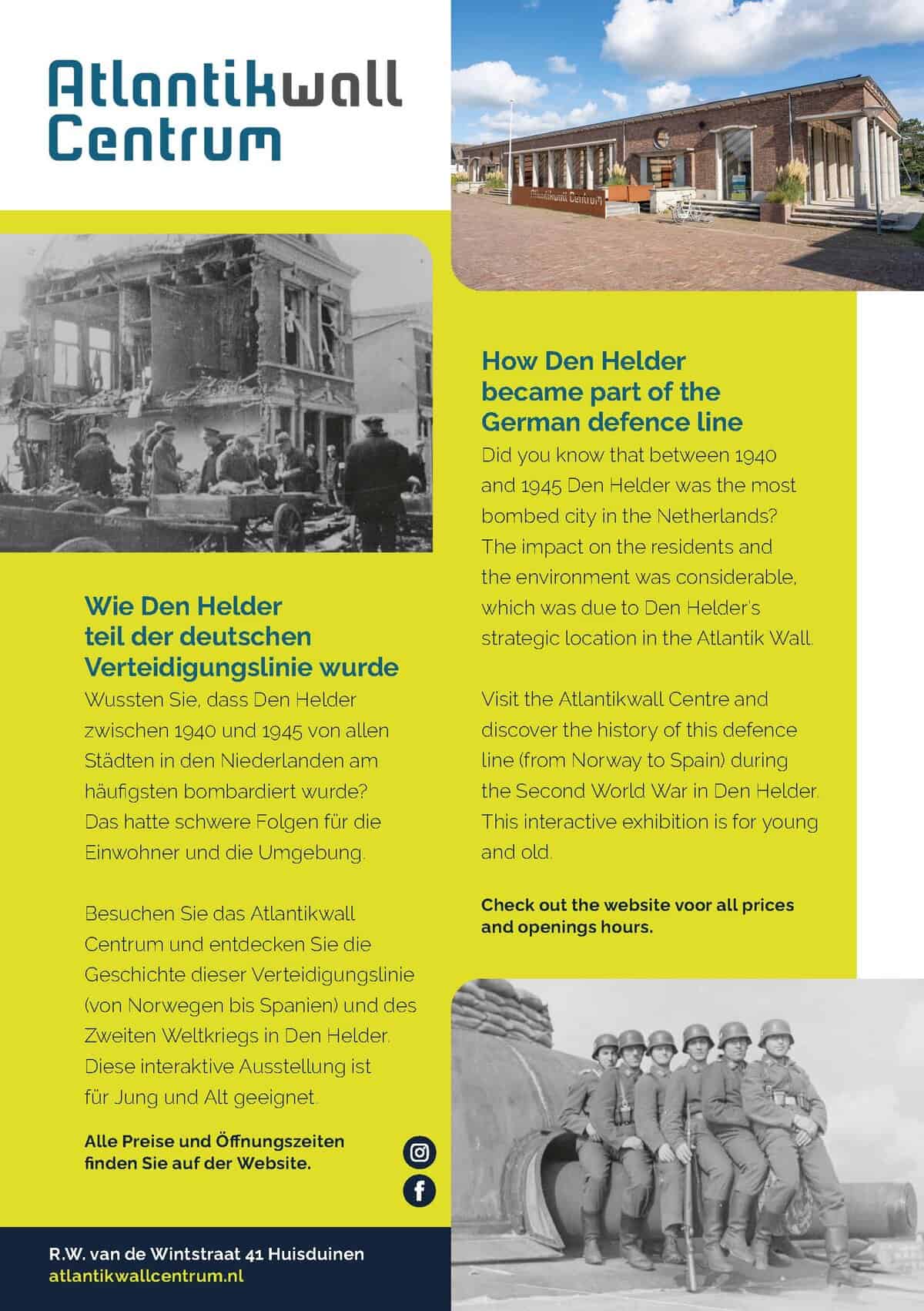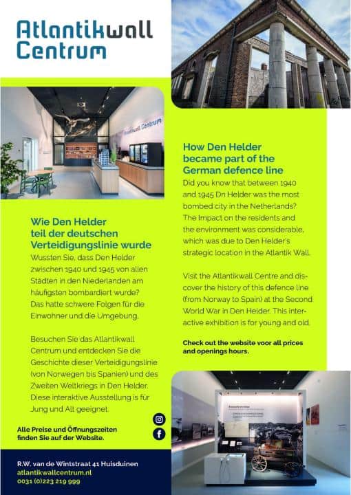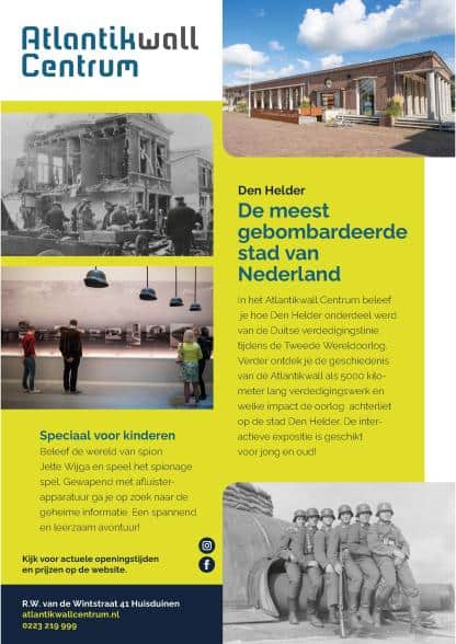 Den Helder maakte deel uit van de Atlantikwall, die door de Duitse bezetter gebouwd werd in de 2de Wereldoorlog. Deze meer dan 5000 kilometer lange verdedigingslinie liep van Noorwegen tot Spanje. In de restanten van een indrukwekkend gebouw uit deze periode is hét Atlantikwall Centrum gevestigd.