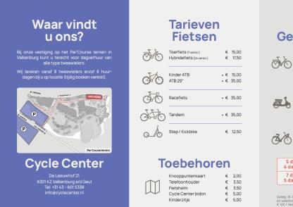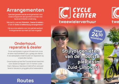 Cycle Center Tweewielerverhuur is hét verhuurbedrijf voor fietsen, groenfietsen (electrofietsen), hybride fietsen, ATB’s, Vespa’s, scooters, steps, racefietsen en veel meer voor u als individuele gast in het Zuid-Limburgse heuvelland of voor u als organisator van een groepsevenement. Wij bezorgen per jaar meer dan 50.000 huurfietsen vanaf onze basis op locatie door heel Nederland en België zelfs door heel Europa. U mag verzekerd zijn van het allerbeste materiaal van bekende merken als Gazelle, Giant, Koga Miyata en Merida in de allerbeste staat van onderhoud. Uw tweewieler is nooit ouder dan 3 jaar.