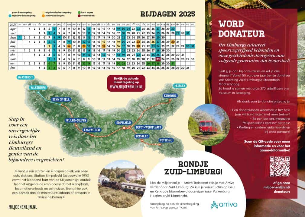 Raadpleeg onze website www.miljoenenlijn.nl voor de rijdagen en actuele dienstregeling.