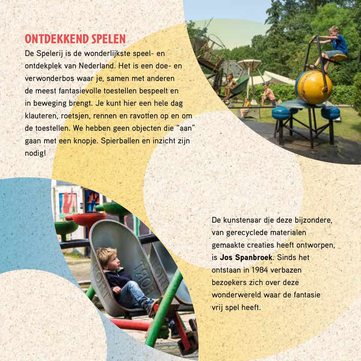 De Spelerij is een bijzondere speelplek. De meest ongewone speeltuin die je ooit hebt gezien. Eigenlijk is het meer een doe-, samenwerk- en verwondertuin waar je, samen met anderen, de meest fantasievolle toestellen bedient en in beweging brengt. De hele dag kun je hier klauteren, roetsjen, rennen en ravotten op en om de toestellen. Daar krijg je natuurlijk honger van. Geen punt: op De Spelerij bak je je eigen broodjes!