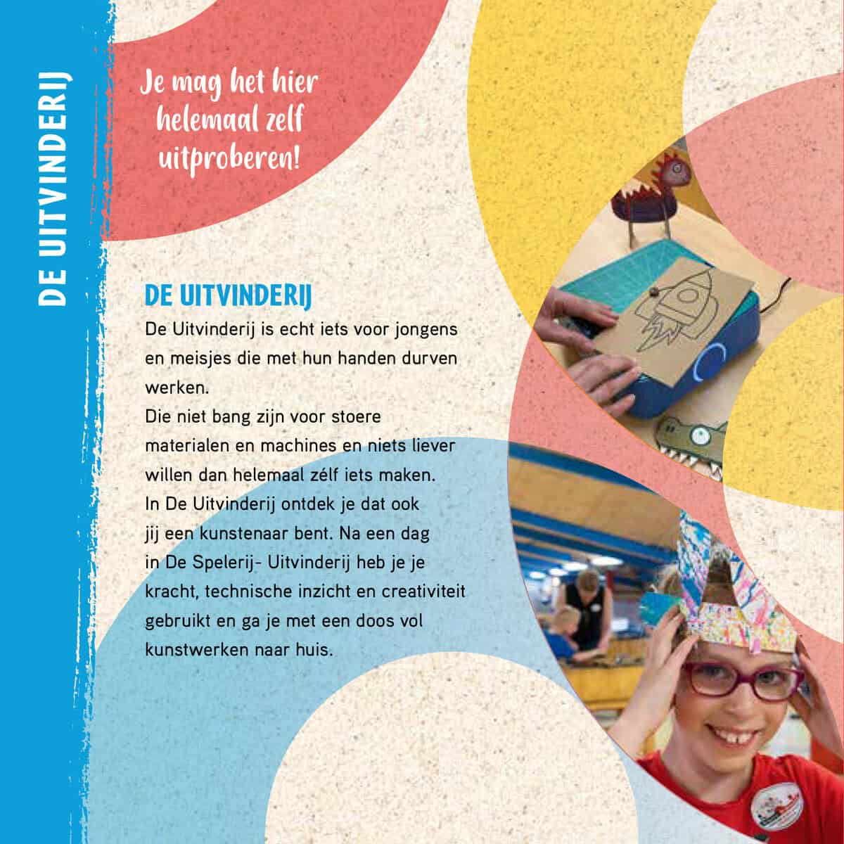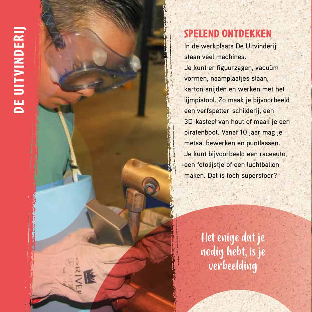 De Uitvinderij is eigenlijk een enorme werkplaats. Hier maak je je eigen kunstwerk. Van hout, metaal, plexiglas of piepschuim. Of van al die materialen samen. Dat doe je met behulp van echte gereedschappen en machines. Natuurlijk is er begeleiding. En ouders mogen ook meewerken. Maar in De Uitvinderij gaat het om wat jij zélf maakt
