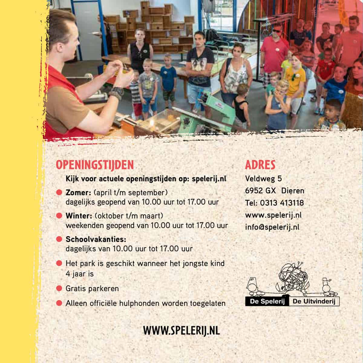 Spelend ontdekken en ontdekkend spelen. Deze woorden zeggen alles over De Spelerij – De Uitvinderij in Dieren (Gld). Kinderen – maar ook volwassenen – komen hier erachter hoe creatief ze eigenlijk zijn. En dat is vaak veel creatiever dan ze zelf denken. Want werkelijk iedereen kan zelf iets maken. Het enige wat je nodig hebt, is je verbeelding.