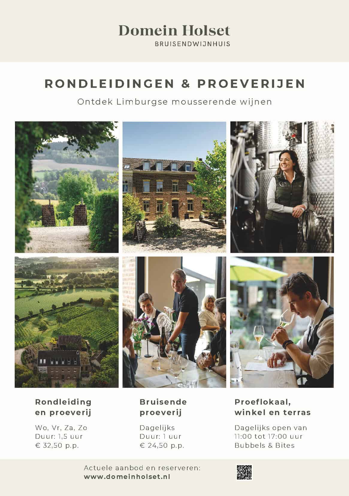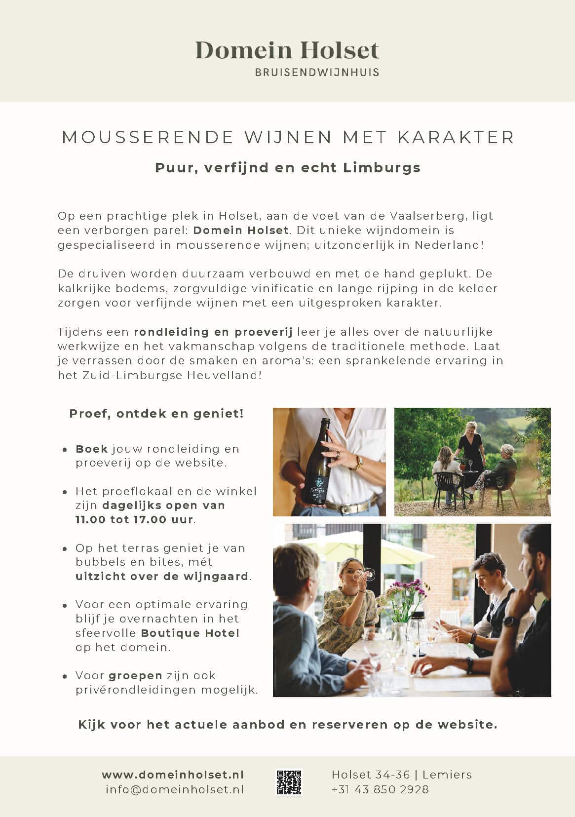 Tijdens een rondleiding en proeverij leer je alles over de natuurlijke werkwijze in de wijngaard en ontdek je hoe echte Limburgse mousserende wijnen gemaakt worden. Het proeflokaal en de wijnwinkel op het domein zijn dagelijks geopend van 11.00 tot 17.00 uur, reserveren is niet nodig.