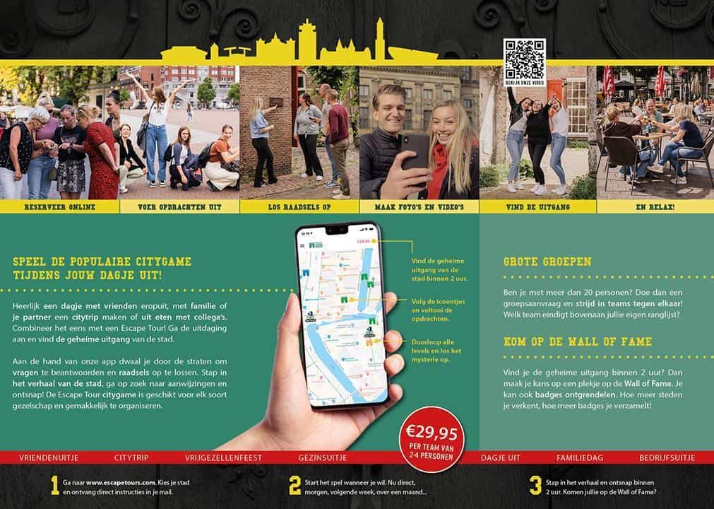 De leukste manier om een stad te ontdekken. Met Escape Tours ga je samen met je team op zoek naar de geheime uitgang van de stad. Aan de hand van een app los je raadsels op en kom je langs de mooiste onontdekte plekjes. Beschikbaar in meer dan 200 steden en direct te spelen met je eigen smartphone. En het leuke? Ieder stad heeft een eigen unieke storyline die past bij een figuur uit de stad uit het verleden. Zo speel je in iedere stad een anders spel.