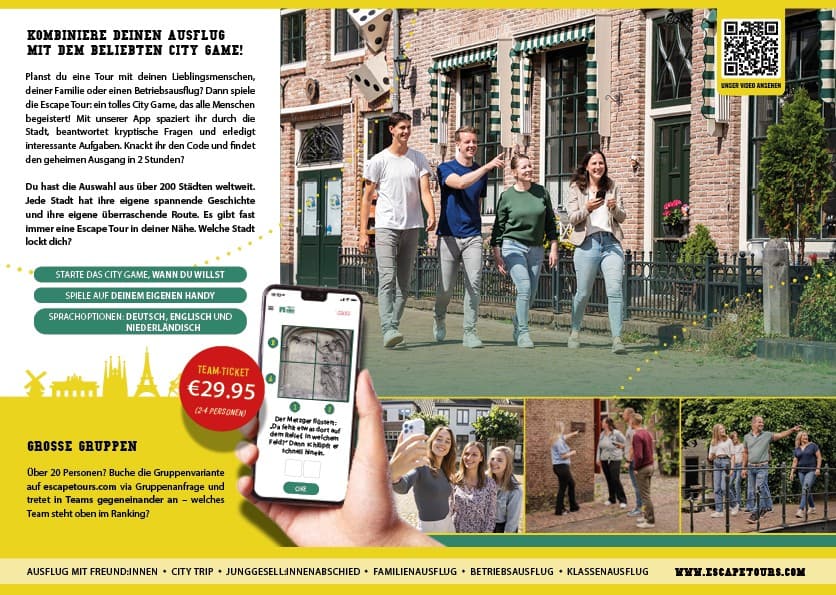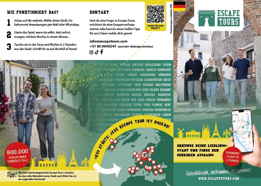 De leukste manier om een stad te ontdekken. Met Escape Tours ga je samen met je team op zoek naar de geheime uitgang van de stad. Aan de hand van een app los je raadsels op en kom je langs de mooiste onontdekte plekjes. Beschikbaar in meer dan 200 steden en direct te spelen met je eigen smartphone. En het leuke? Ieder stad heeft een eigen unieke storyline die past bij een figuur uit de stad uit het verleden. Zo speel je in iedere stad een anders spel.