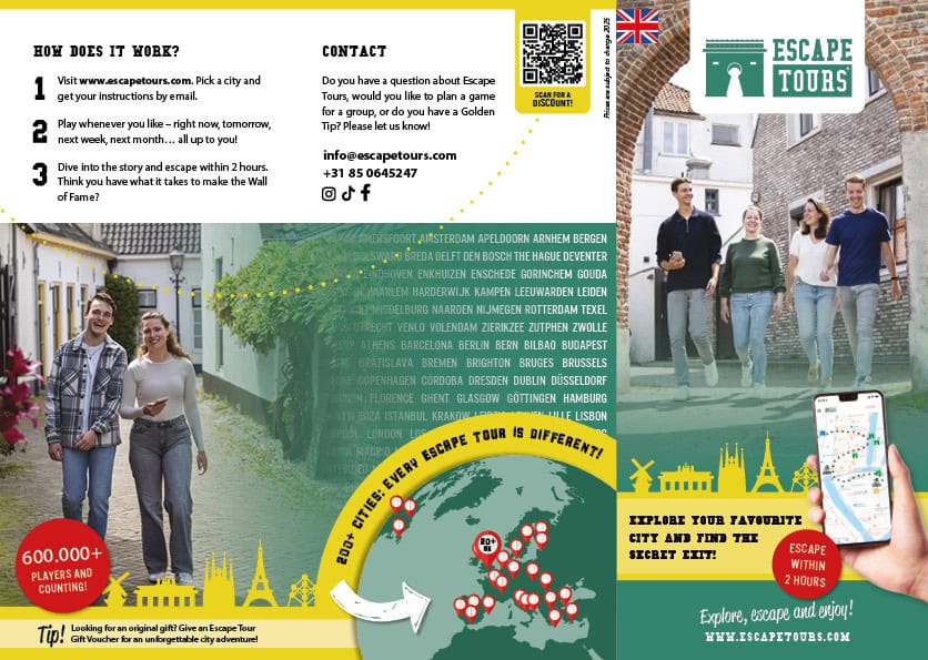 De leukste manier om een stad te ontdekken. Met Escape Tours ga je samen met je team op zoek naar de geheime uitgang van de stad. Aan de hand van een app los je raadsels op en kom je langs de mooiste onontdekte plekjes. Beschikbaar in meer dan 200 steden en direct te spelen met je eigen smartphone. En het leuke? Ieder stad heeft een eigen unieke storyline die past bij een figuur uit de stad uit het verleden. Zo speel je in iedere stad een anders spel.