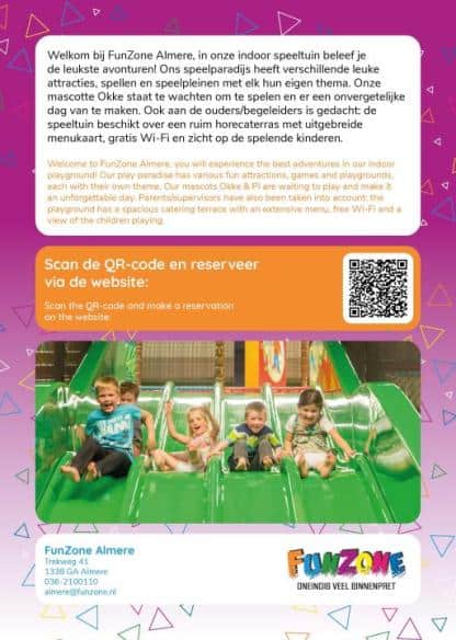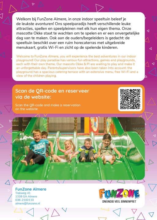 Welkom bij FunZone Almere, de grootste binnenspeeltuin van Almere! Betreed een wereld vol avontuur, waar de kinderen kunnen genieten van de leukste spellen en attracties in elke hoeken en gaten van ons speelparadijs. Onze mascottes Okke & Pi heten de kinderen bovendien van harte welkom en vergezellen hen graag op hun nieuwste avontuur in FunZone.