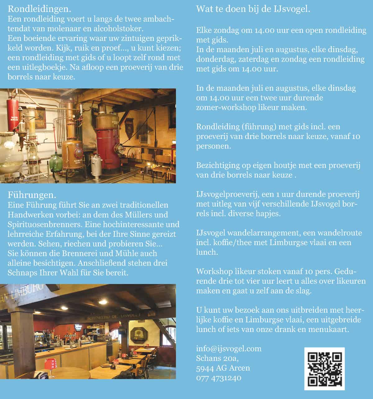 Bij een rondleiding of bezichtiging kan men de twee ambachten, molenaar en stoker aanschouwen. Ook organiseert de IJsvogel diverse wandeltochten, workshops likeur maken en diverse proeverijen.