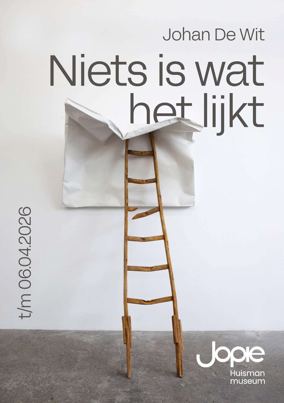 De tentoonstelling vormt een verrassende dialoog tussen De Wit en Jopie Huisman. “Beiden koesteren het alledaagse en tonen de schoonheid van wat versleten is”, vertelt museumdirecteur Peter Miedema. “Maar waar Huisman het afgedankte redde door het heel precies na te schilderen, construeert De Wit het vergankelijke opnieuw. Dat spel van schijn en werkelijkheid past prachtig bij ons museum. We zijn dan ook trots dat wij de eerste grote Nederlandse tentoonstelling van De Wit mogen laten zien.”