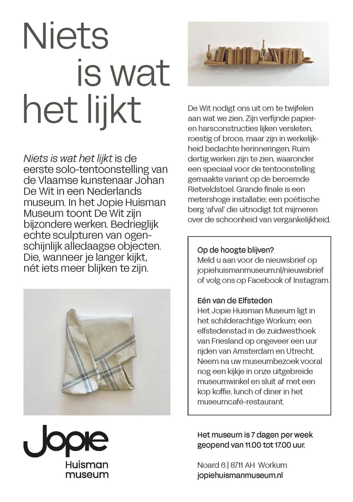 Nu te zien: de tentoonstelling Niets is wat het lijkt van de Vlaamse kunstenaar Johan de Wit. Zijn eerste grote solo-tentoonstelling in een Nederlands museum. De Wit staat bekend om zijn bedrieglijk echte sculpturen van ogenschijnlijk alledaagse objecten die, wanneer je langer kijkt, nét iets meer blijken te zijn.
