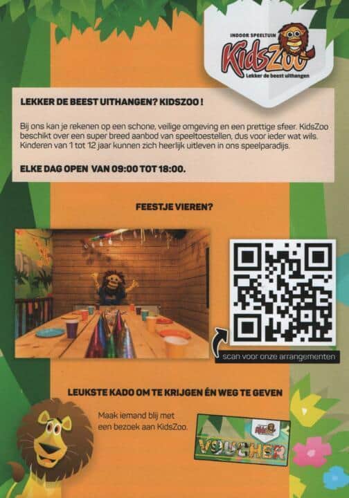 Bij ons kan je rekenen op een schone, veilige omgeving en een prettige sfeer. KidsZoo beschikt over een super breed aanbod van speeltoestellen, dus voor ieder wat wils. Kinderen van 1 tot 12 jaar kunnen zich heerlijk uitleven in ons speelparadijs. Slinger door de jungle, glijd samen met je vriendjes van de bandenglijbaan, spring zo hoog als je kan op de trampo’s, speel een potje voetbal/basketbal, scoor de meeste punten op de interactieve klimmuur, leg een uitdagend parcours af met SisyFox, verzamel ballen voor de ballendouche, klauter op de klimvulkaan en roetsj van alle glijbanen.