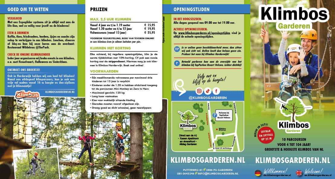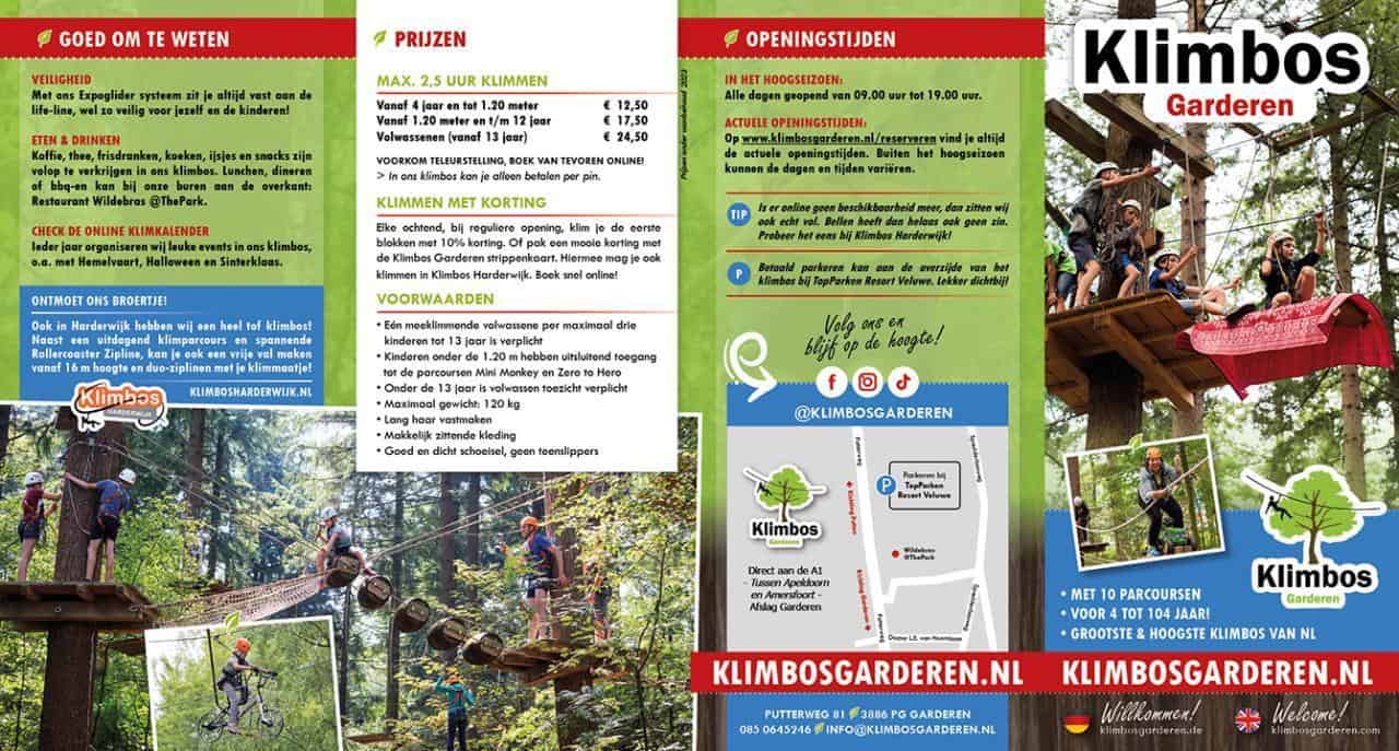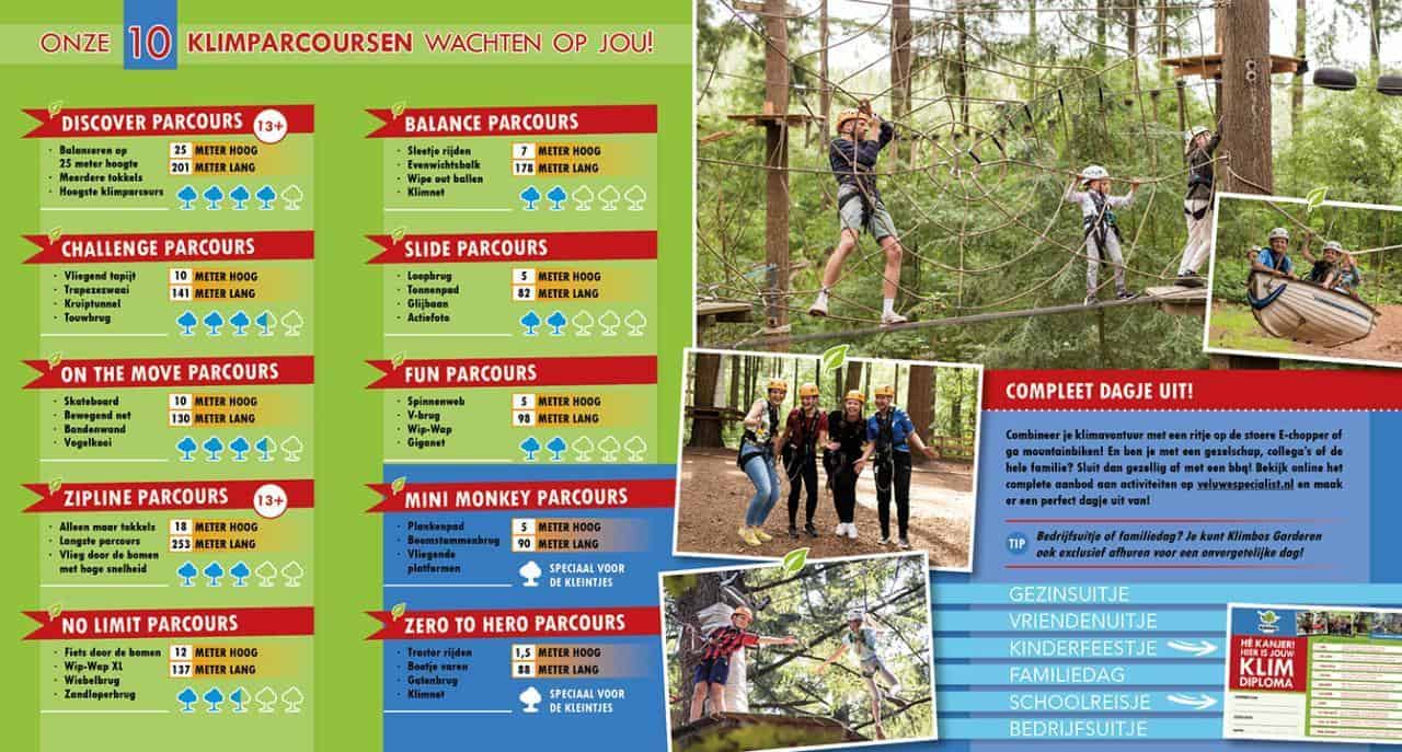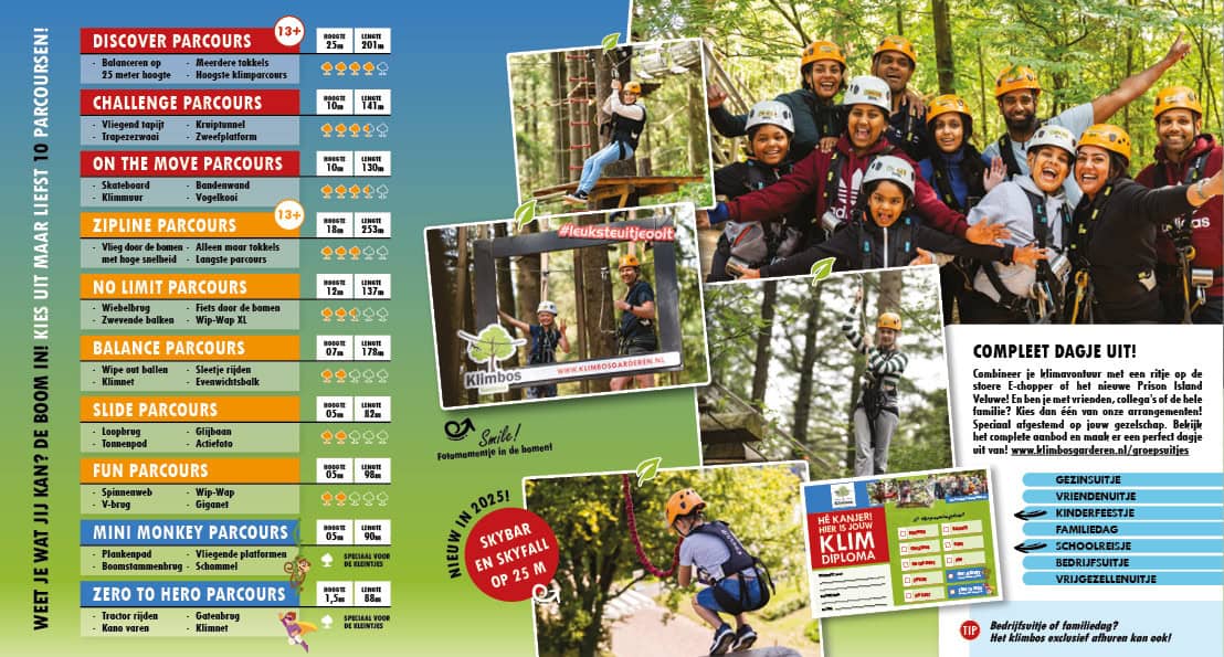 Dit is het hoogste en veiligste klimbos van Nederland. Met parcoursen voor kinderen vanaf 4 jaar. M[BN4.1]idden in de natuur van de Veluwe, biedt het uitdaging voor iedereen. Dankzij het continue zekersysteem kunnen ook onervaren klimmers veilig de boom in. Daarmee stijg je tot hoogtes van wel 25 meter! Durf jij vanaf deze hoogte een sprong vanaf onze Skyfall in het diepe te wagen? Dan kun je daarna genieten van een drankje in de Skybar. Een absolute aanrader voor avontuurlijke gasten die letterlijk de hoogte in willen.