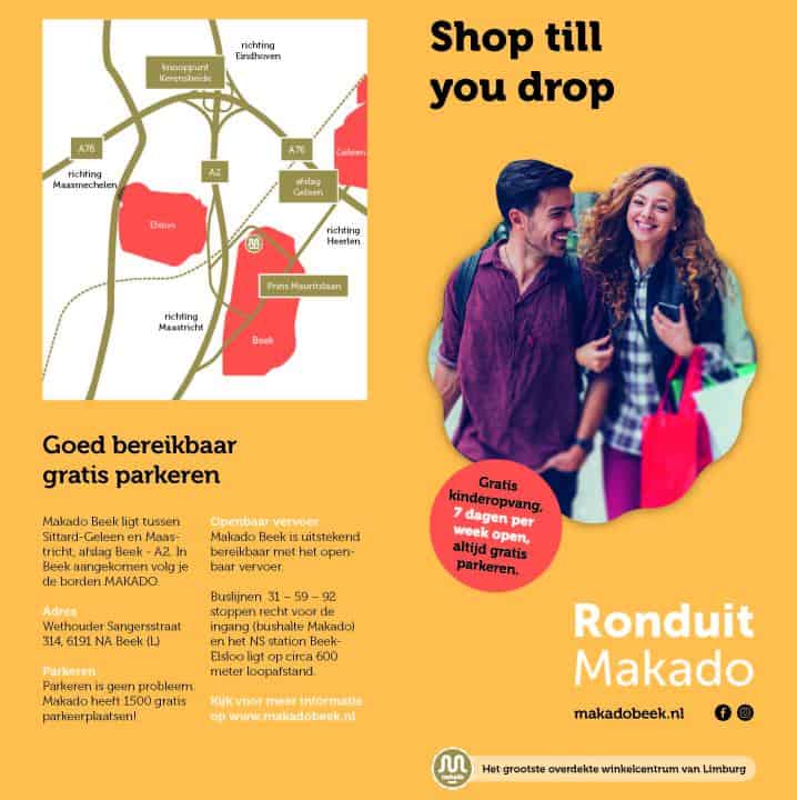 65 winkels onder 1 dak – altijd gratis parkeren – gratis kinderopvang. Zorgeloos en overdekt winkelen? Kom dan naar Makado Beek. Het grootste overdekte winkelcentrum van Limburg met meer dan 65 winkels.. Je vindt in Makado Beek alles op het gebied van mode, lifestyle en beauty tot en met levensmiddelen, elektro, bloemen, speelgoed en de kapper. Bovendien kun je er heerlijk eten en drinken. En dat allemaal onder één dak!. De brede looppaden en ruime winkels maken het shoppen extra comfortabel. Door de ruime gratis parkeerplaats en parkeerdek, breng je de boodschappen eenvoudige naar je auto. Ook bij slecht weer is Makado Beek zeker een bezoekje waard.