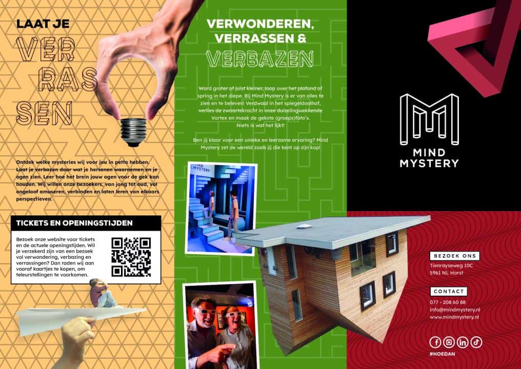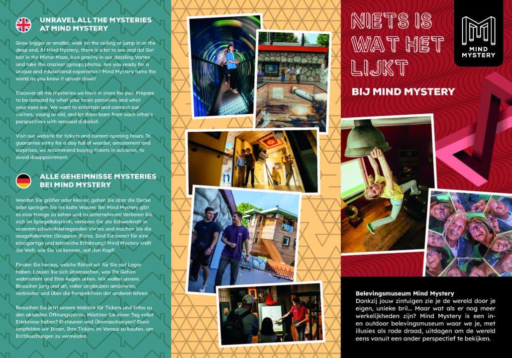 Een perfecte combinatie van plezier, verbeelding en educatie voor jong en oud! Bij Mind Mystery is er van alles te zien en te beleven rondom het thema optische illusies. Bezoek het museum en ontdek alles over de grote kunstenaars, bekijk talloze hologrammen en allerlei optische kunst. Verdwaal in het spiegeldoolhof en verlies de zwaartekracht in een gigantische ruimtelijke illusie. Speel puzzels door het hele park en maak de gekste selfies en groepsfoto’s in Siebrandt’s huis, waar alles ondersteboven is gedraaid. Wordt groter of kleiner in de Ames room en zweef boven de grond op het plein. Dit alles en nog veel meer voor een gezellige ochtend of middag vertier bij Mind Mystery. Mind Mystery is een themapark waar jong en oud zich vermaken en verbazen over alles wat eigenlijk niet kan.