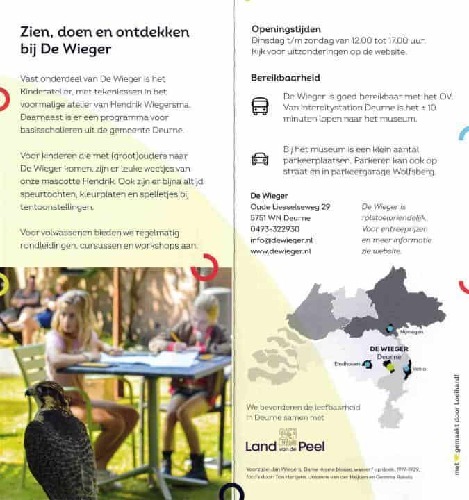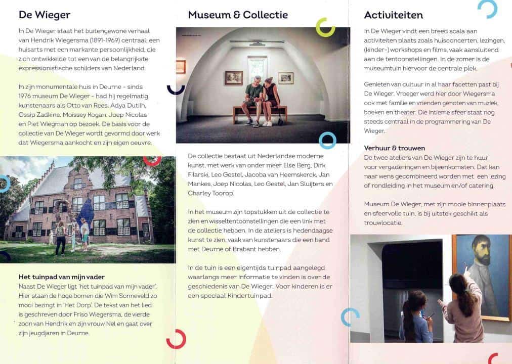 Museum De Wieger is gevestigd in het voormalige woonhuis, dokterspraktijk en schildersatelier van Hendrik Wiegersma (1891-1969). In het huis krijg je een beeld van het zijn leven en werk. Wisselende exposities sluiten aan bij de collectie van het museum. In de ateliers zie je wisseltentoonstellingen van hedendaagse kunstenaars, vaak uit Deurne en omgeving.