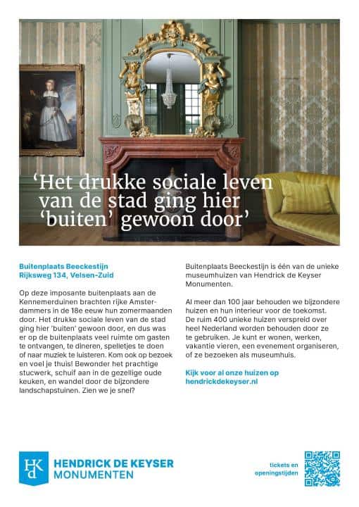 Op deze imposante buitenplaats aan deKennemerduinen brachten rijke Amsterdammersin de 18e eeuw hun zomer maanden door. Het drukke sociale leven van de stadging hier ‘buiten’ gewoon door, en dus was er op de buitenplaats veel ruimte om gasten te ontvangen, te dineren, spelletjes te doen of naar muziek te luisteren. Kom ook op bezoeken voel je thuis! Bewonder het prachtige stucwerk, schuif aan in de gezellige oude keuken, en wandel door de bijzondere landschapstuinen. Zien we je snel?