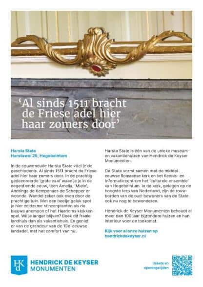 De State vormt samen met de middeleeuwse Romaanse kerk en het Kennisen Informatie centrum het ‘culturele ensemble’ van Hegebeintum. In de kerk, gelegen op de hoogste terp van Nederland, zijn de rouw borden van de oud bewoners van de State ook nu nog te bewonderen. Hendrick de Keyser Monumenten behoudt al meer dan 100 jaar bijzondere huizen en hun interieur voor de toekomst. Kijk voor al onze huizen www.ophendrickdekeyser.nl
