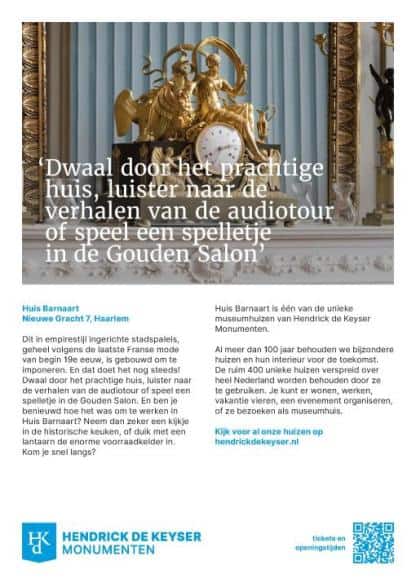 Kom je snel langs? Huis Barnaart is één van de unieke museum huizen van Hendrick de Keyser Monumenten.