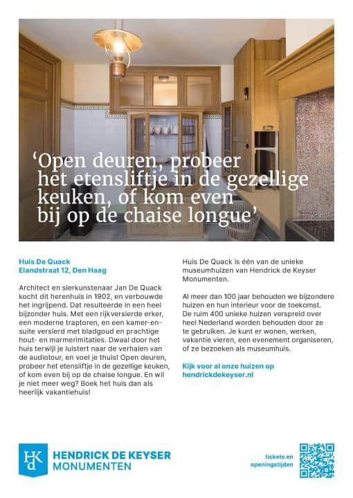 Architect en sierkunstenaar Jan De Quack kocht dit herenhuis in 1902, en verbouwde het ingrijpend. Dat resulteerde in een heel bijzonder huis. Met een rijkversierde erker, een moderne traptoren, en een kamer-en-suite versierd met bladgoud en prachtige houten marmerimitaties. Dwaal door het huis terwijl je luistert naar de verhalen van de audiotour, en voel je thuis! Open deuren, probeer het etensliftje in de gezellige keuken, of kom even bij op de chaise longue. En wil je niet meer weg? Boek het huis dan als heerlijk vakantiehuis!