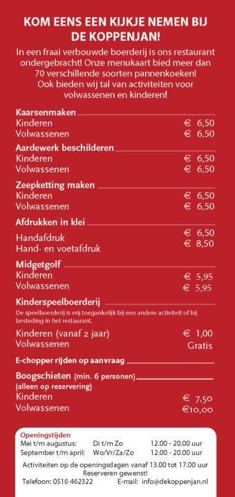 In de sfeervolle pannenkoekenboerderij De Koppenjan eet je de lekkerstepannenkoeken van Friesland. Je kiest uit wel 80 hartige en zoete pannenkoeken. In combi met alle activiteiten is uit eten met kinderen 1 groot feest bij De Koppenjan in Friesland! Ga gezellig kaarsen maken, pottenbakken, zeepketting maken, aardewerk beschilderen, midgetgolfen of spelen op de kinderspeelboerderij. Ook organiseren we kinderfeestjes, schoolreisjes en familiefeesten. En voor zakelijke arrangementen is onze zaalverhuur perfect.