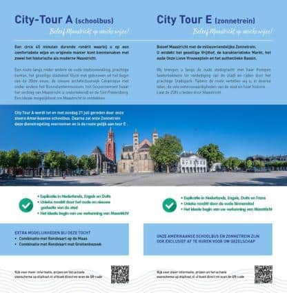 Onze stoere Amerikaanse schoolbussen verzorgen City-Tours door Maastricht en laten u op een originele manier kennis maken met de stad. Ook een combinatie van de schoolbus en de boot behoren tot de mogelijkheden.