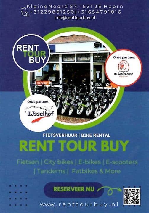 RentTourBuy Hoorn doet, zoals de naam al zegt, aan verhuren, toeren en verkopen. Ontdek Hoorn op een van onze fietsen uit de fietsverhuur en geniet van de historische locaties, de gezelligheid en de fraaie natuur in de omgeving. Wilt u een meer unieke manier van voortbewegen, probeer dan eens de Segway, E-Chopper of de E-Kickbike.