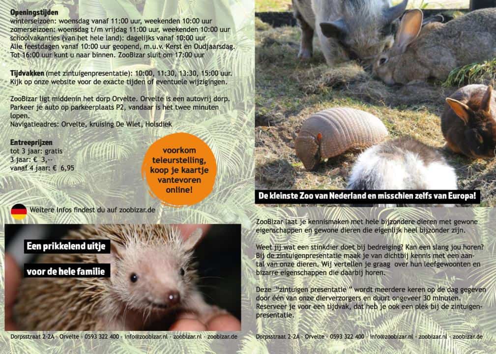 Zoo Bizar is een kleinschalig bedrijf met als doelstelling mensen op een directe manier kennis te laten maken met diverse diersoorten. Zoo ; met een knipoog naar dierentuin, en Bizar slaat op de bijzondere en wonderlijke dieren en hun eigenschappen. Op orginele wijze zijn er verschillende kleine (exotische) diersoorten te bewonderen.